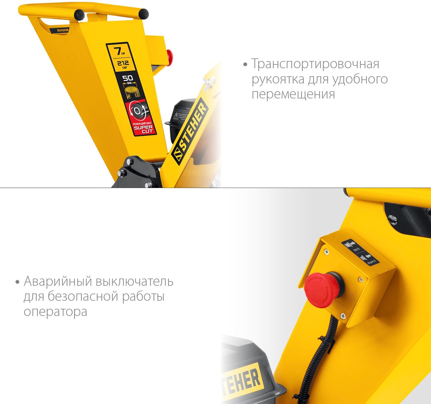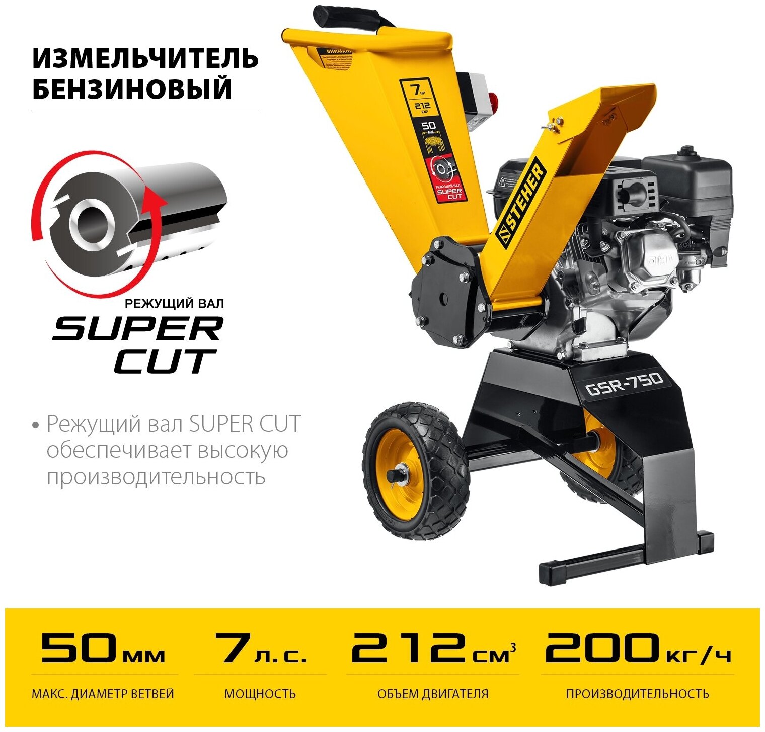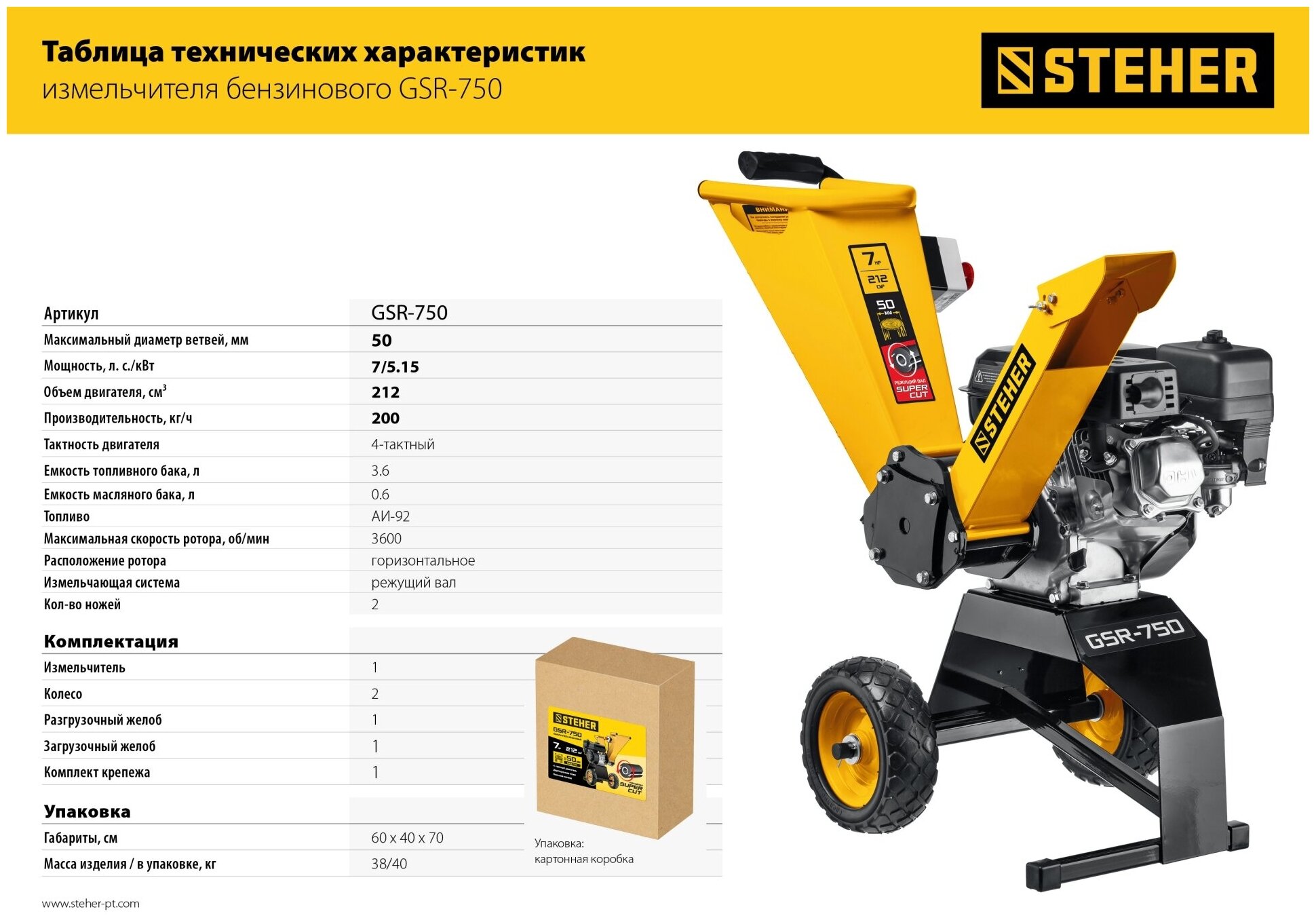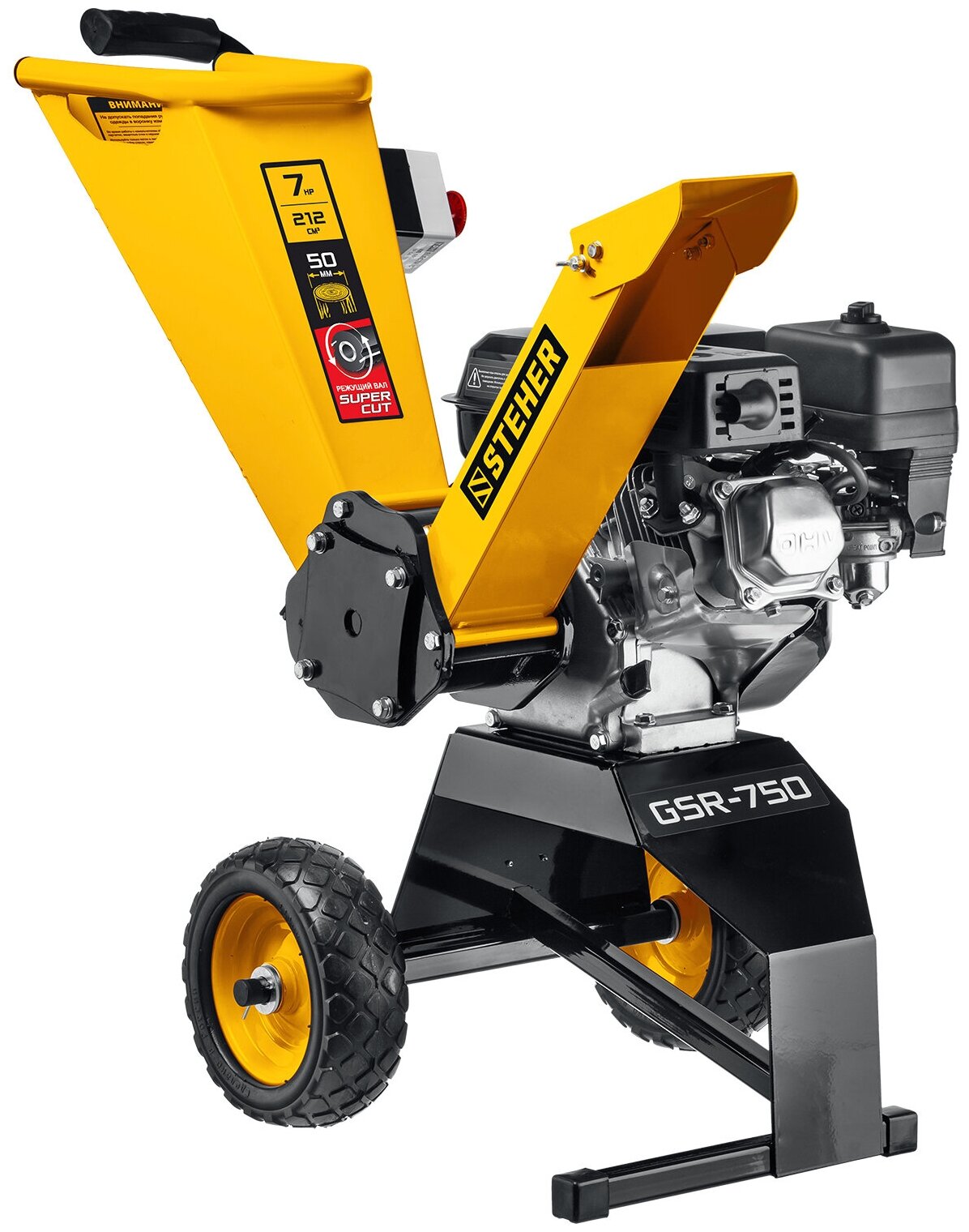 Engine type: gasoline, power: 5150 W, power: 7 hp, purpose: chopping branches, chopping system: cutting knives, branches diameter: 40–50 mm, capacity: from 100 to 500 kg/h