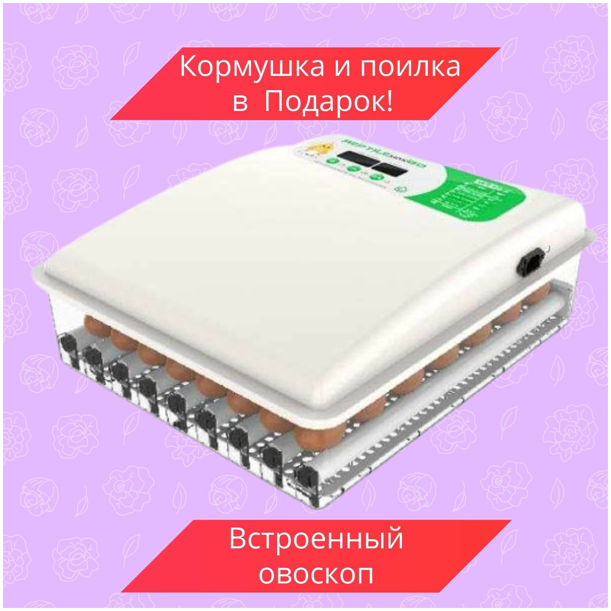 Type: incubator, purpose: household, number in the set: 1 pieces, flipping: automatic, type of eggs: pigeon, goose, turkey, chicken, quail, duck, features: automatic switching to emergency power