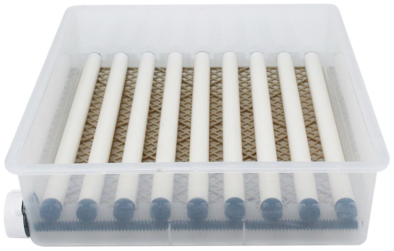 Incubator, set of trays, ultrasonic humidifier, 220 V power cord, 12 V external power cord, volumetric plastic flask, hatching grid, foam casing, instruction manual