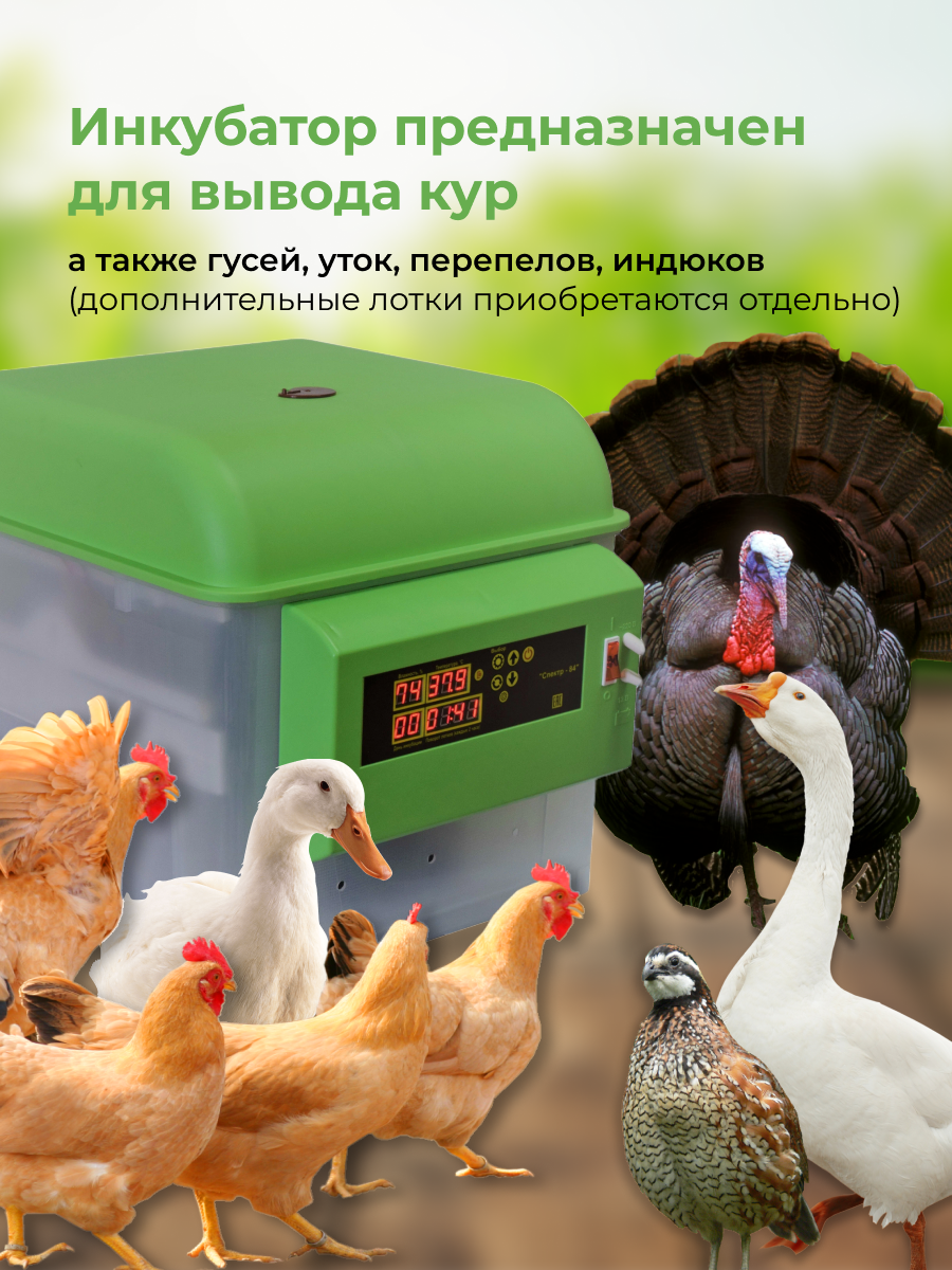 Type: incubator, purpose: household, flip: automatic, type of eggs: chicken, quail, duck, features: automatic switching to emergency power, auto-rotation of trays, auto-maintenance of the set temperature