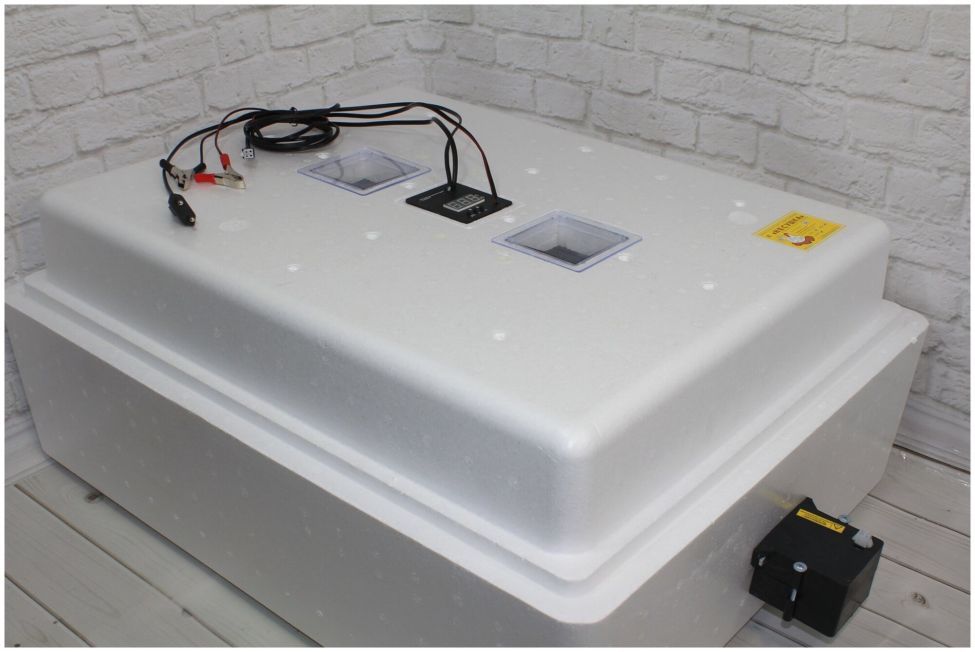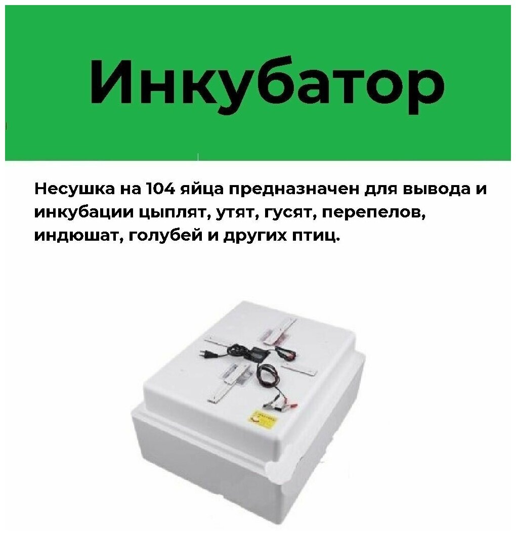 Type: incubator, purpose: household, quantity in a set: 1 pieces, flip: automatic, type of eggs: goose, chicken, quail, duck, features: automatic switching to emergency power, auto-rotate tray