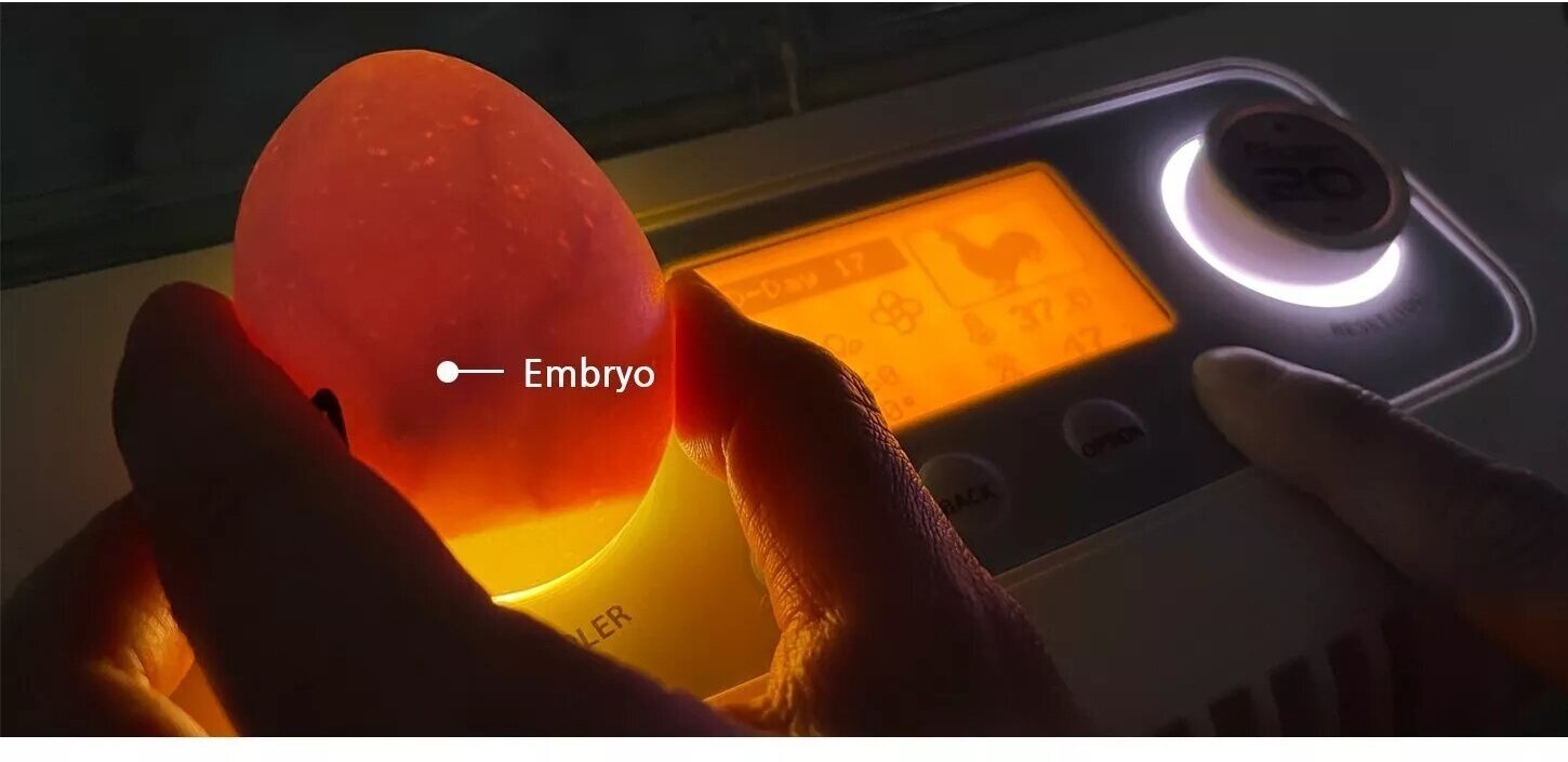 Auto-rotation of trays, auto-supply of water into the chamber, auto-maintenance of the set temperature, humidity level sensor, adjustment of the frequency of turning eggs, with an ovoscope