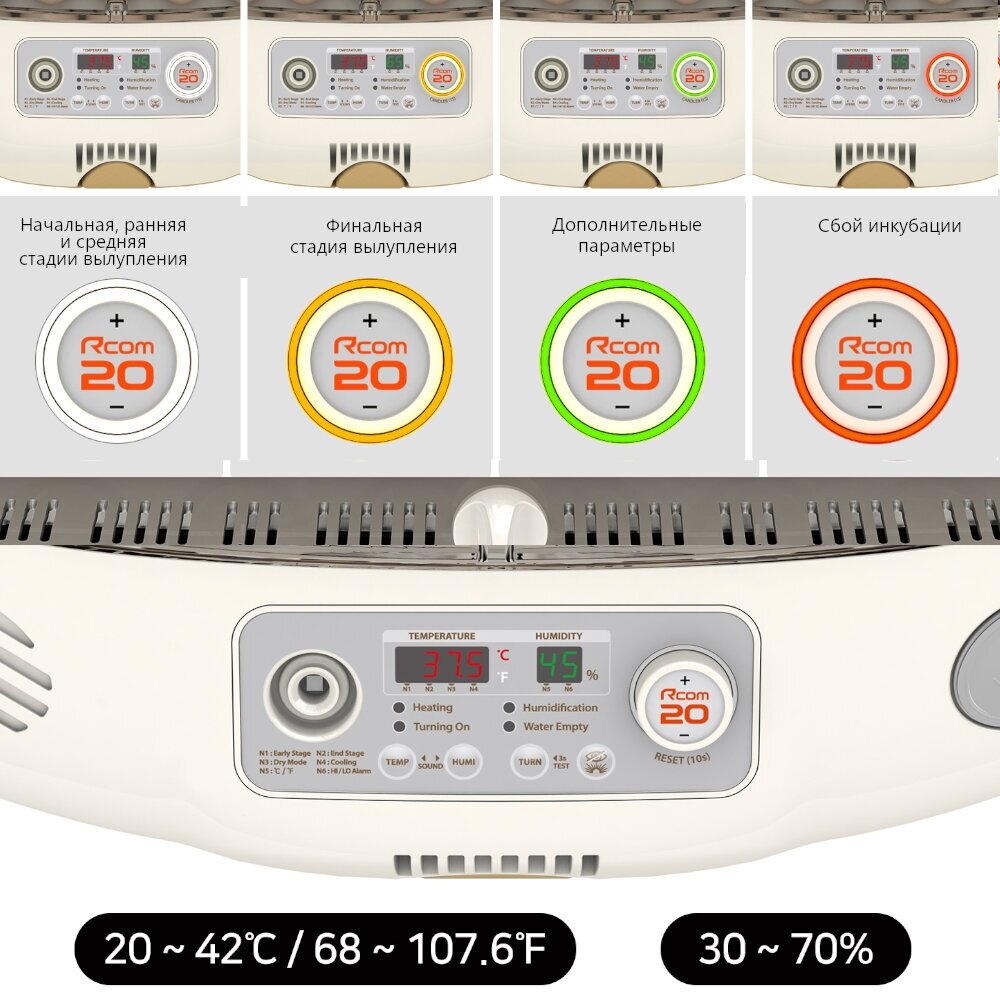 Auto-rotation of trays, auto-supply of water into the chamber, auto-maintenance of the set temperature, humidity level sensor, adjustment of the frequency of turning eggs, with an ovoscope