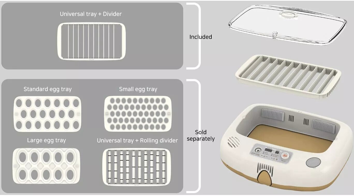 Incubator; power cord standard; universal tray with 10 dividers in individual series can be replaced with three trays for small, medium and large eggs; instruction in Russian