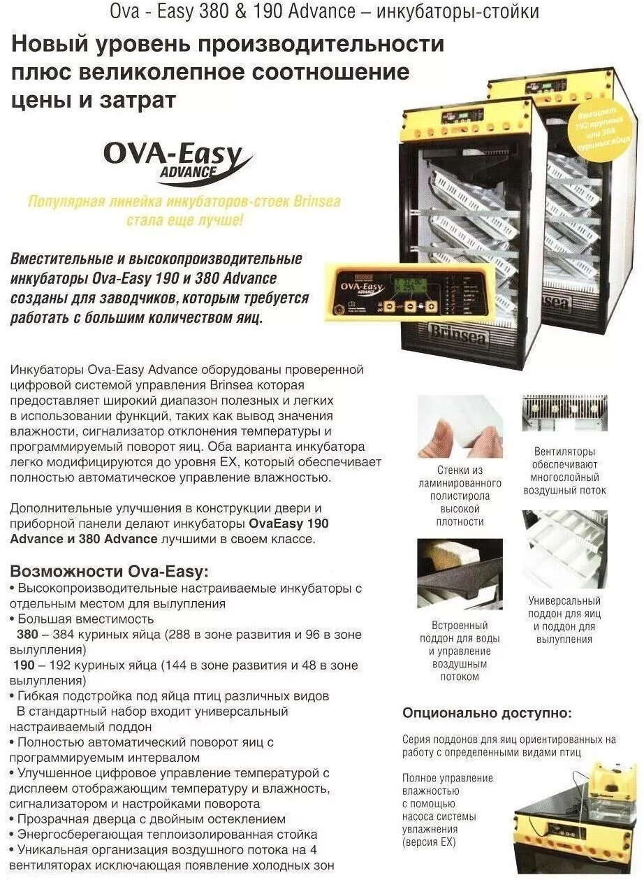 Automatic supply of water to the chamber, automatic maintenance of the set temperature, humidity level sensor, adjustment of the egg turning frequency