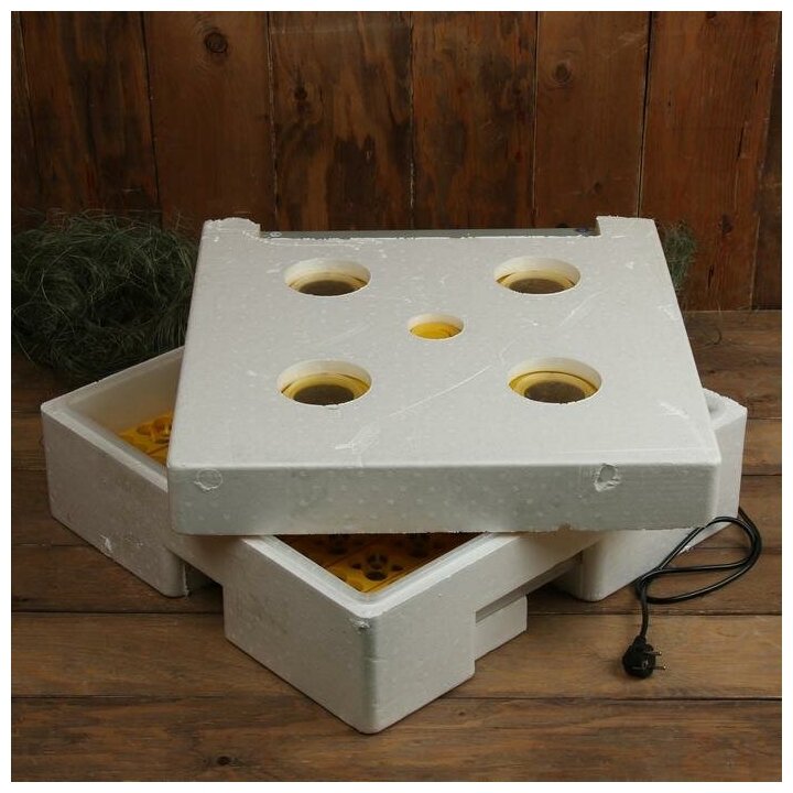 Type: incubator, flipping: automatic, type of eggs: goose, chicken, quail, features: automatic switching to emergency power supply, automatic maintenance of the set temperature, humidity level sensor, with wax