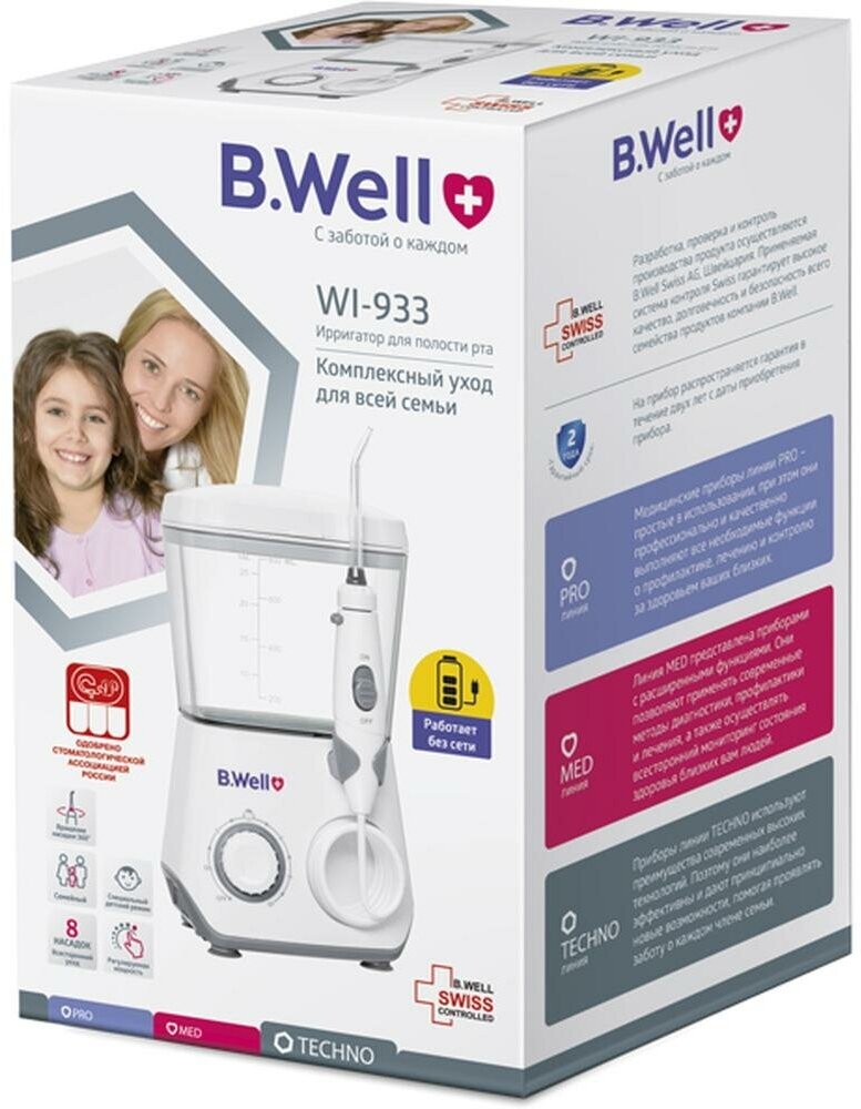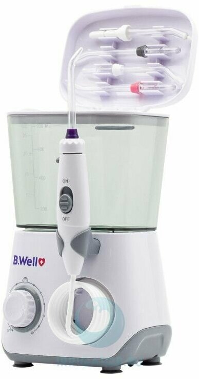 Power supply: battery, mains, type: irrigator, principle of operation: impulse, nozzles: for jet cleaning, for cleaning implants and crowns, for cleaning the tongue, nozzle-brush, orthodontic for braces, periodontal
