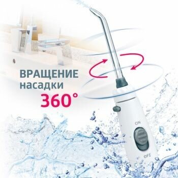 Works both from the mains and autonomously from the battery, anti-slip stable legs, special mode for children; type of pressure adjustment: smooth; spray time: 180 s; water pulsation frequency: 1700 pulses/min; time
