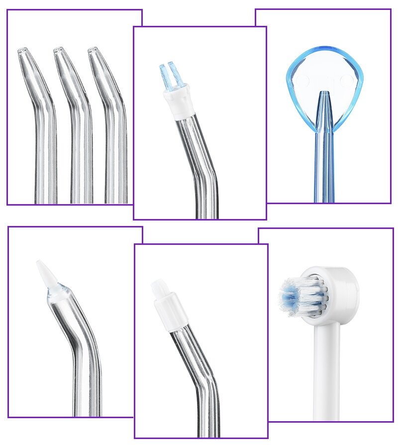 Irrigator: cover of the reservoir and container for storing nozzles - 1 pc., classic jet nozzle - 3 pcs., nozzle for removing tartar and plaque from under the gum line - 1 pc., nozzle for orthodontic constructions - 1