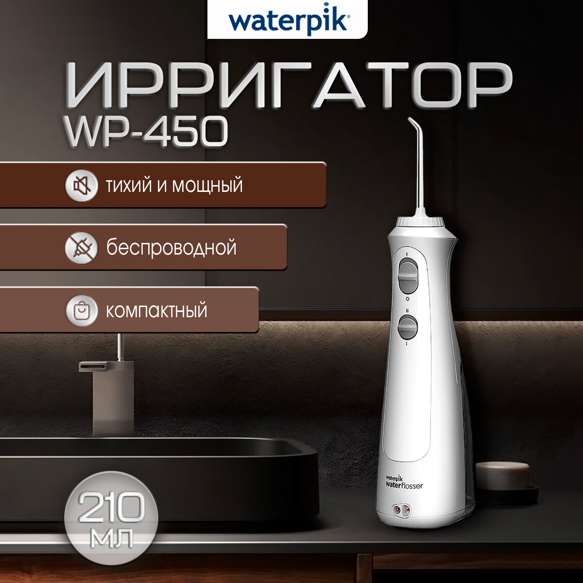 The main device is the Waterpik WP 450 E2 irrigator; standard nozzle - 1 piece; nozzle for cleaning the tongue and cheeks - 1 pc.; orthodontic nozzle - 1 pc.; implant nozzle - 1 pc.; Charger