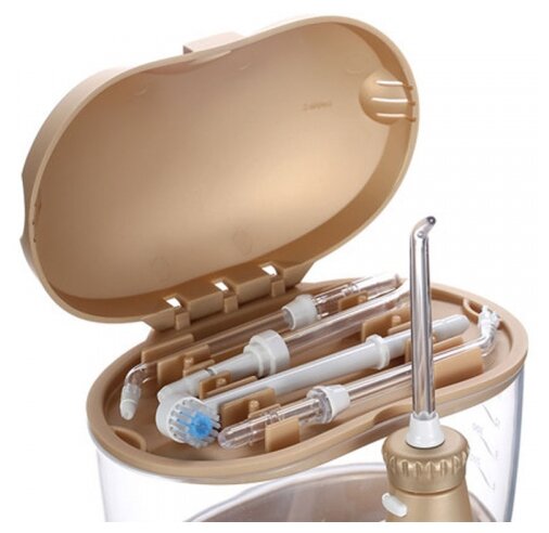 Power supply: from the mains, type: irrigator, principle of operation: impulse, nozzles: for jet cleaning, for cleaning implants and crowns, brush nozzle, orthodontic for braces, periodontal for gums, tank capacity