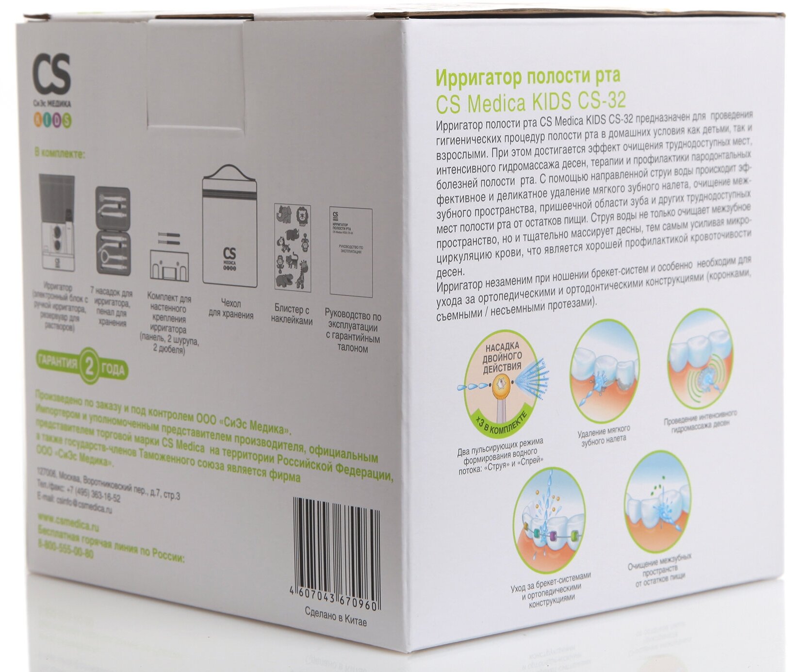 Power supply: from the mains, type: irrigator, principle of operation: impulse, nozzles: for jet cleaning, for cleaning the tongue, brush head, orthodontic for braces, periodontal for gums, reservoir capacity: 850 ml, max.