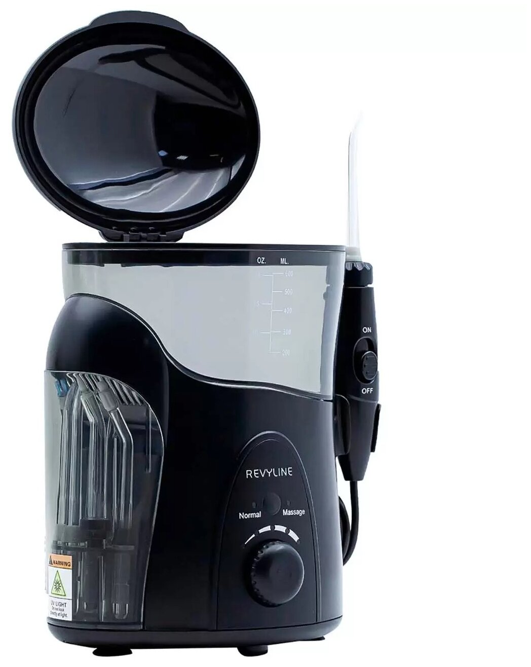 The main block of the irrigator Revyline RL 500; standard nozzle - 3 pcs.; periodontal nozzle - 1 pc.; orthodontic nozzle for the care of structures - 1 pc.; nozzle for cleaning the tongue - 1 pc.; nozzle for cleaning implants - 1