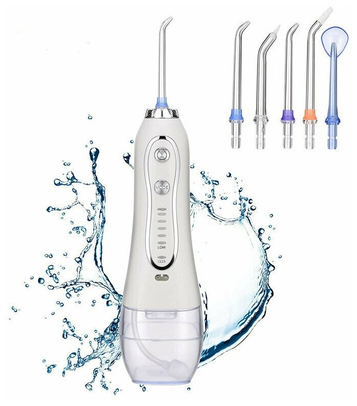 Power supply: battery powered, type: irrigator, principle of operation: impulse, nozzles: for jet cleaning, for cleaning implants and crowns, for cleaning the tongue, orthodontic for braces, periodontal for gums, container