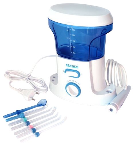 Power supply: from the mains, type: irrigator, principle of operation: impulse, nozzles: for jet cleaning, for tongue cleaning, orthodontic for braces, periodontal for gums, tank capacity: 600 ml, maximum pressure