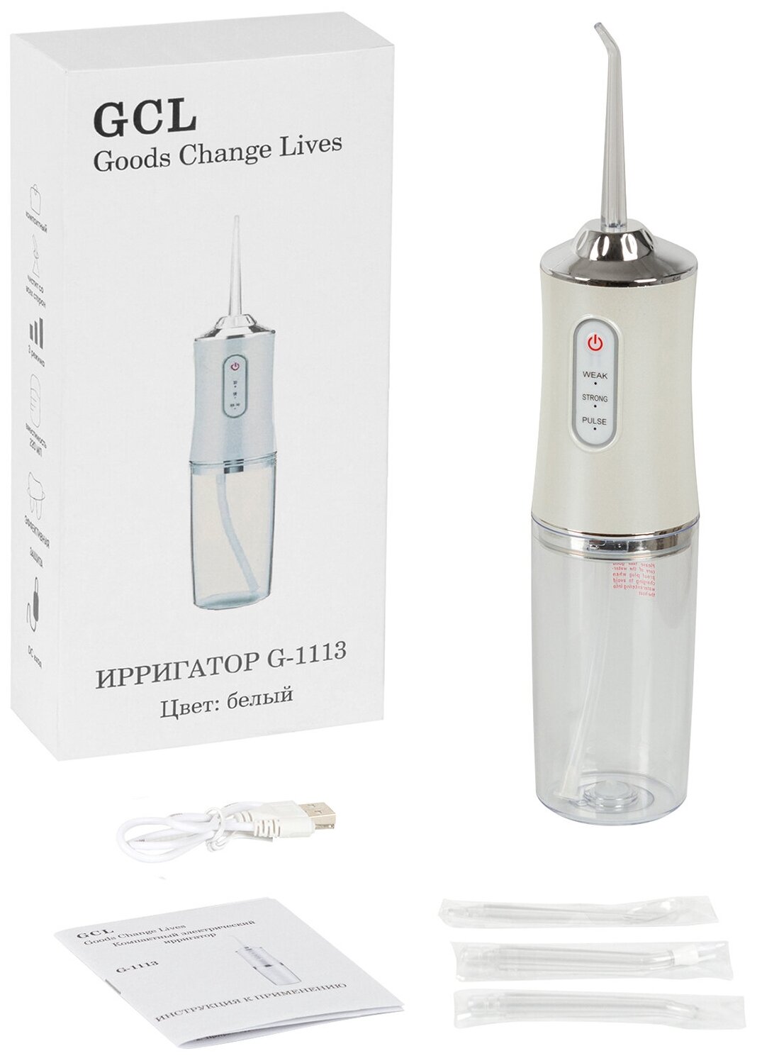 Irrigator block, 4 nozzles, USB charging cable, manual, box