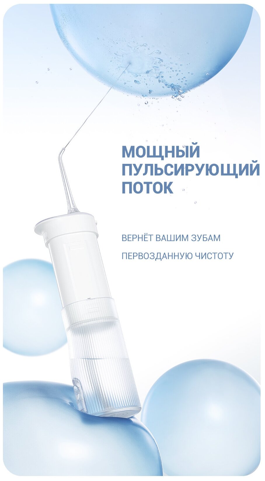 Powered: by battery, type: dental center, principle of operation: microbubble technology, nozzles: for jet cleaning, brush head, periodontal for gums, number of irrigator modes/adjustments: 3, modes: page