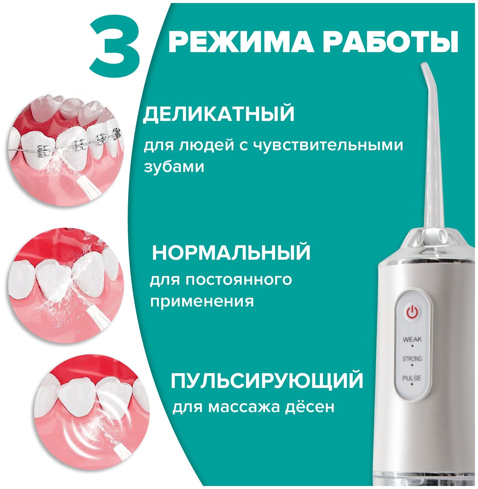 Power: battery, mains, type: irrigator, principle of operation: impulse, mono-jet, manual, nozzles: for tongue cleaning, orthodontic for braces, periodontal for gums, plaque remover, container
