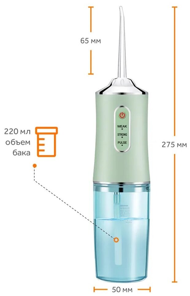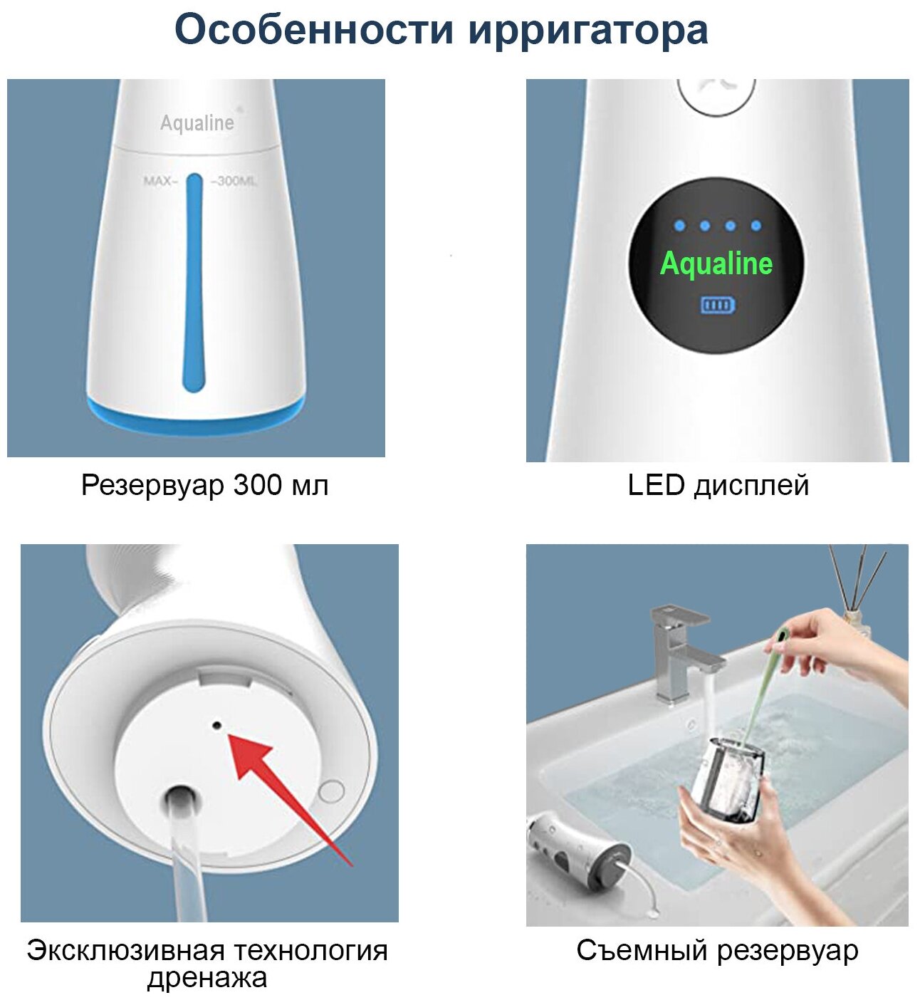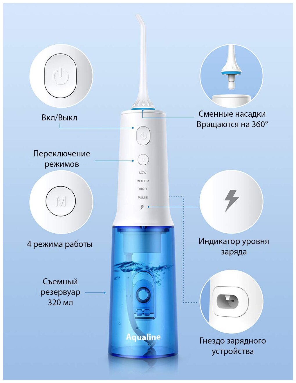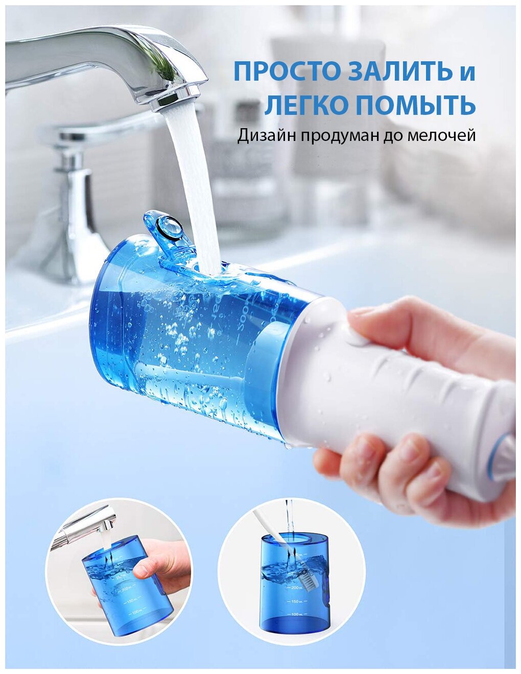 Power supply: battery powered, type: irrigator, principle of operation: impulse, nozzles: for jet cleaning, for tongue cleaning, orthodontic for braces, periodontal for gums, For the entire surface, For interdental pr