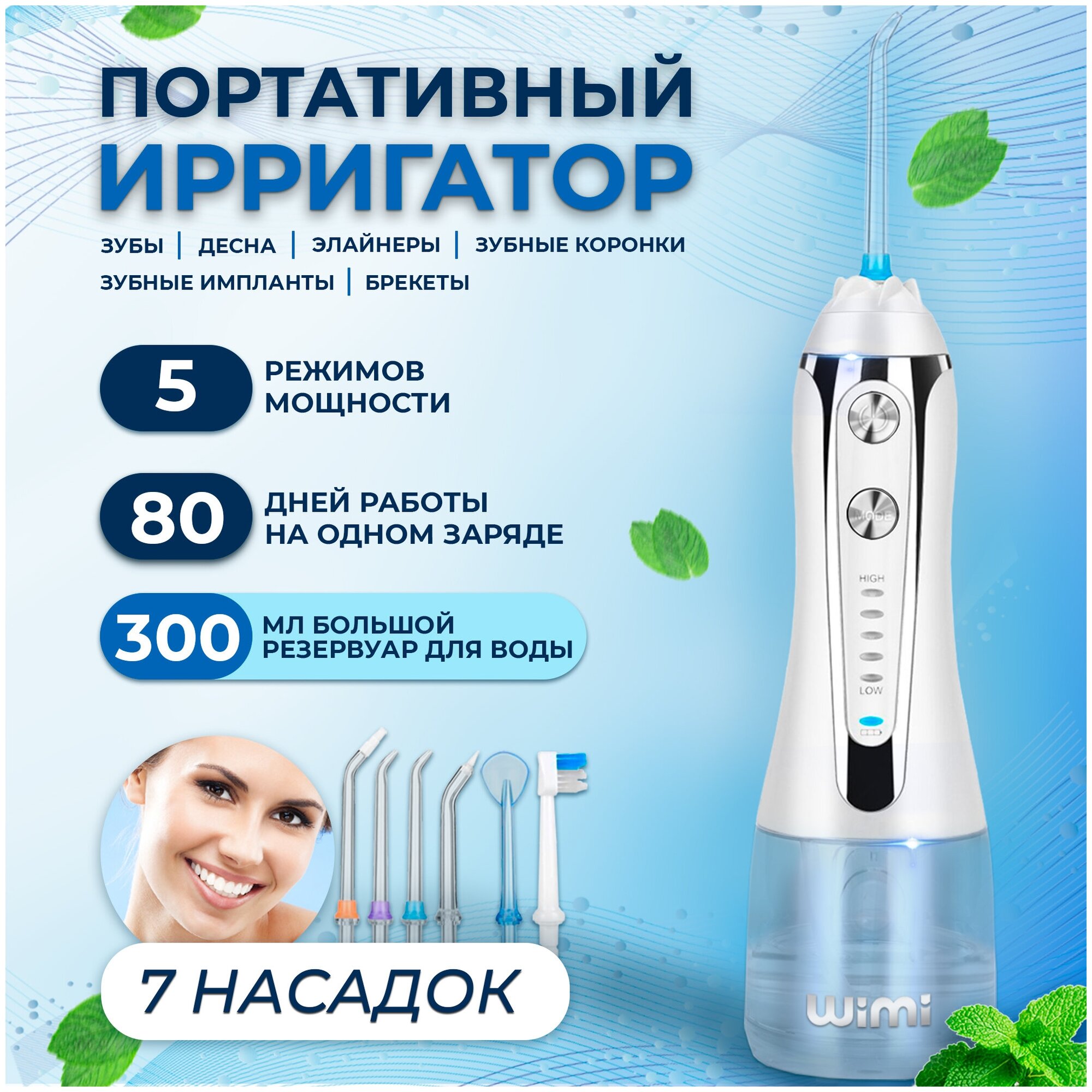 Power supply: battery powered, type: irrigator, principle of operation: impulse, nozzles: for cleaning implants and crowns, for cleaning the tongue, brush nozzle, orthodontic for braces, periodontal for gums, cutting capacity