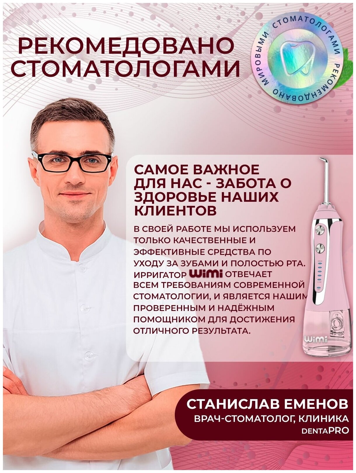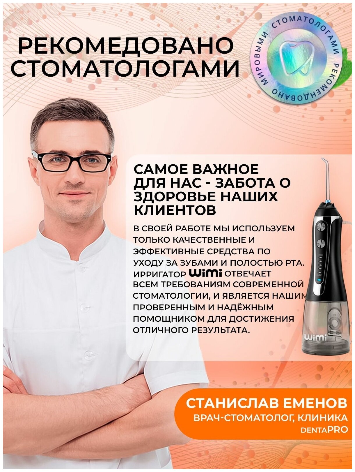 Powered: by battery, type: dental center, principle of operation: microbubble technology, nozzles: for jet cleaning, brush head, periodontal for gums, number of irrigator modes/adjustments: 3, modes: page