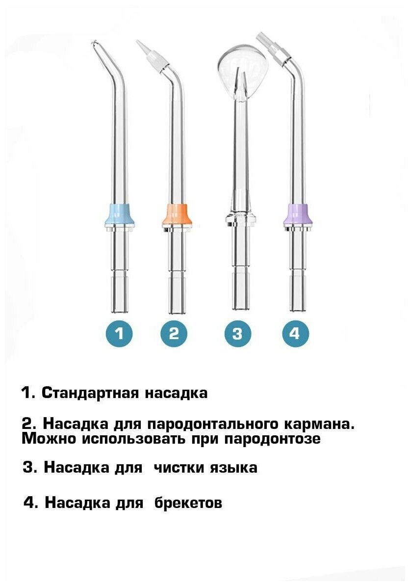 Powered: by battery, type: Irrigator nozzle, principle of operation: monojet, nozzles: for jet cleaning, for cleaning implants and crowns, for cleaning the tongue, nasal, orthodontic for braces, periodontist