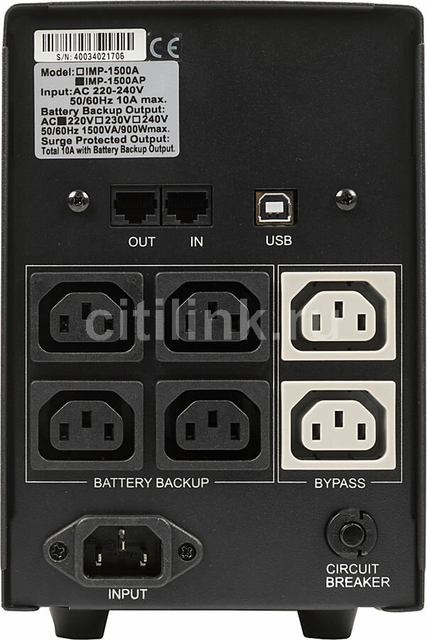 Output power apparent: 1500 VA, output power active: 900 W, type of output power connectors: IEC 320 C13 computer, Number of UPS output power connectors: 4, total number of power output connectors: 6, time