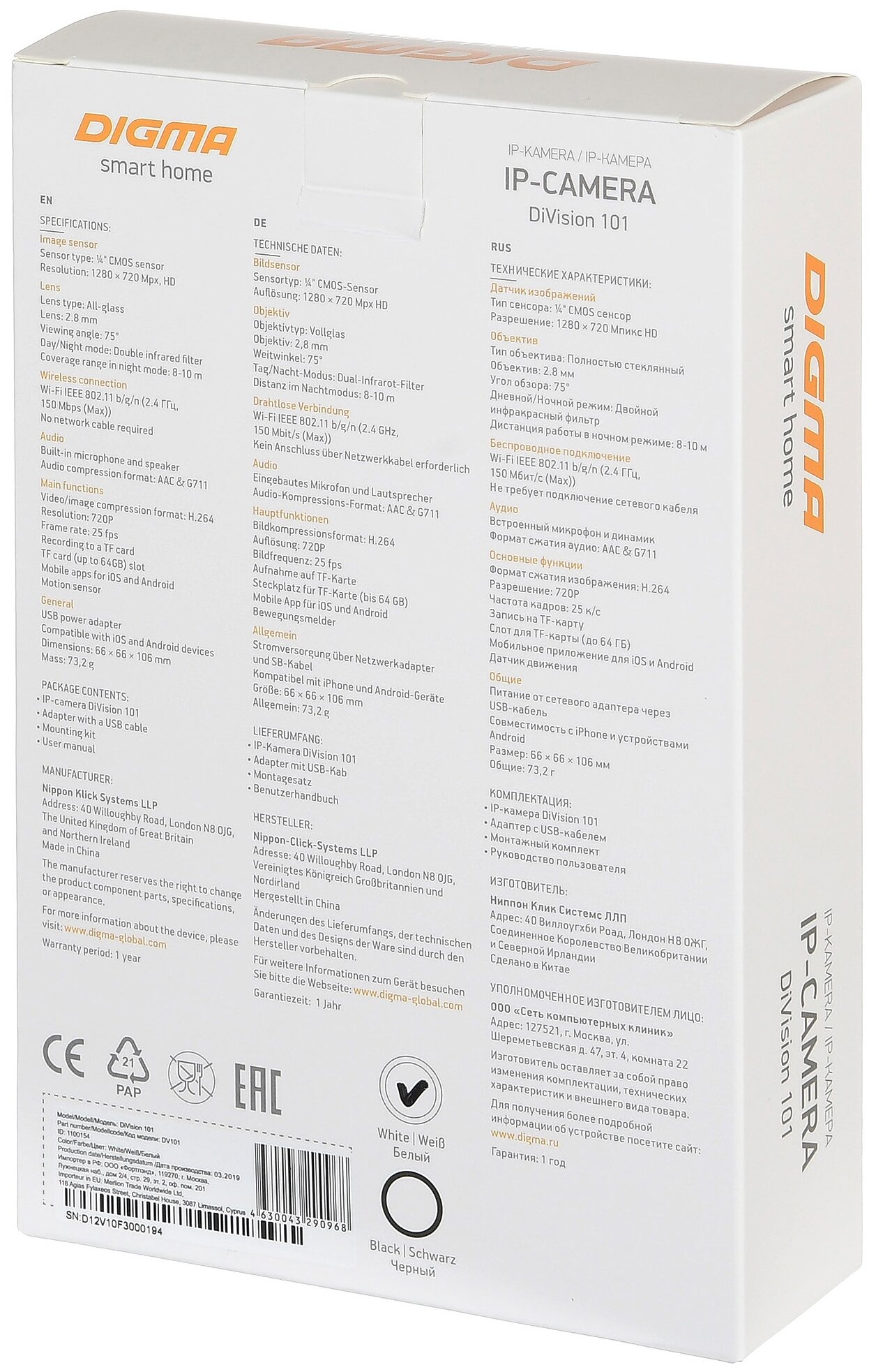 Video camera standard: IP, wireless communication: Wi-Fi, standards support: 802.11g, 802.11n, max. video camera resolution: 1280x720, motion sensors, functions and features: IR illumination, power adapter included, built-in microphone