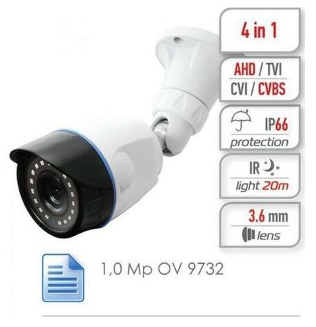 Video camera type: outdoor video camera, video camera standard: AHD, CVBS, max. video camera resolution: 1280x720, functions and features: IR illumination, backlight compensation, night mode, number of megapixels: 1 MP, volume