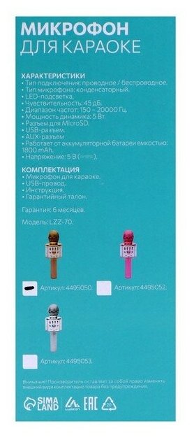 Type: karaoke microphone, karaoke system class: home, features: card reader, portable, connectors and interfaces: Bluetooth, USB, headphone output