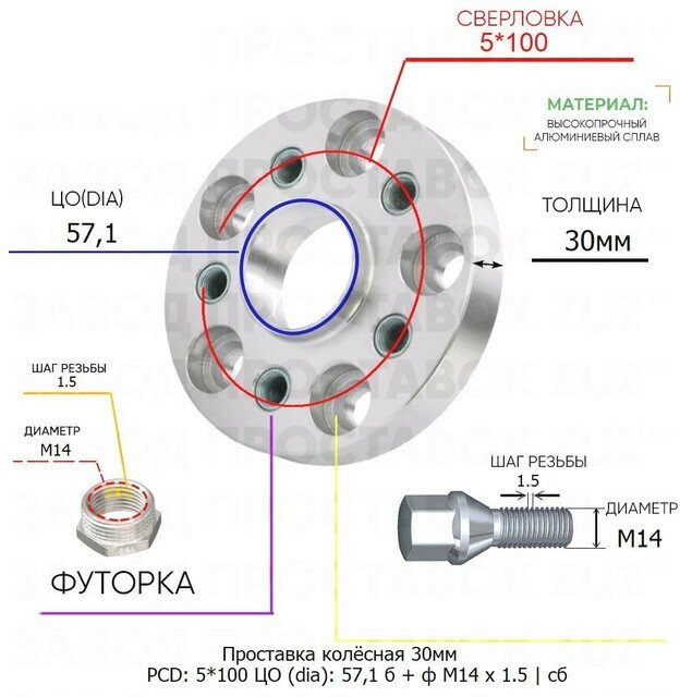 30mm 5*100 CO 57.1 in the set Bolt + Futor M14*1.5
