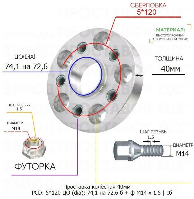 40mm 5*120 CO 74.1 72.6 in the set Bolt + Futorka M14*1.5 hub with collar hub 5x120 5x120
