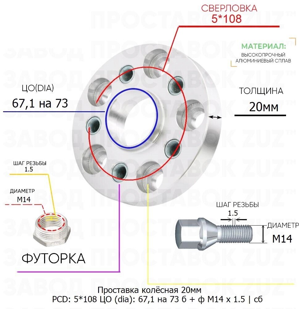 20mm 5*108 TsO 67.1 73 in the set Bolt + Futor M14*1.5 hub with collar hub 5x108 5x108