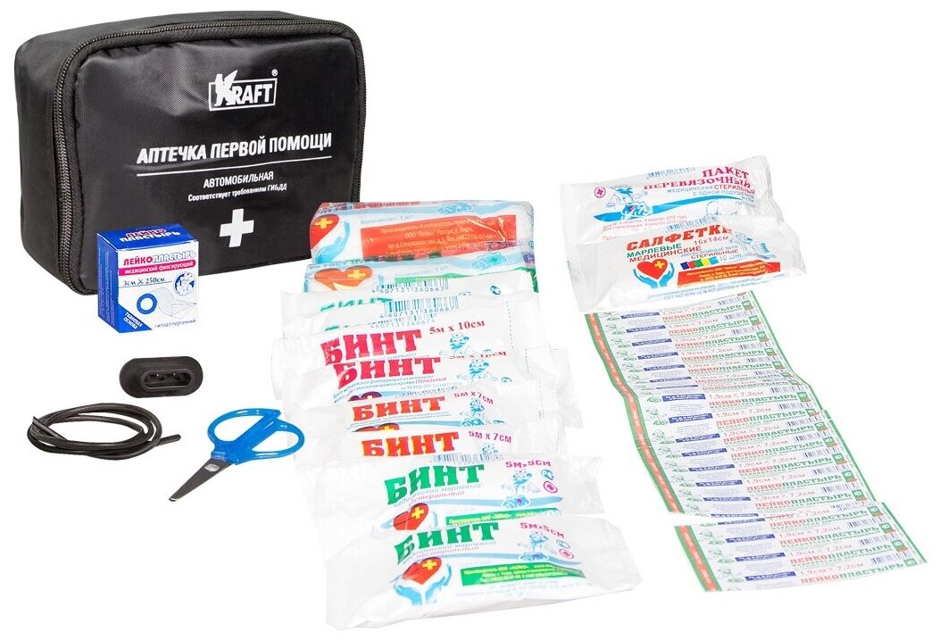Hemostatic tourniquet 1 pc, non-sterile bandages 5 m x 5 cm 2 pcs, non-sterile bandages 5 m x 10 cm 2 pcs, non-sterile bandages 7 m x 14 cm 1 pc, sterile bandages 5 m x 7 cm 2 pcs, sterile bandages 5 m x 10 cm 2 pcs, sterile bandages 7 m x 14 cm 1 pc, ste