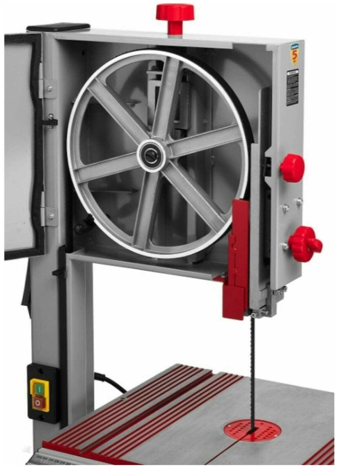Type: vertical, operating principle: semi-automatic, maximum workpiece height: 80 mm, power: 350 W, voltage: 220 V, processing material: wood, metal, plastic, blade length: 1425 mm, work table length: 290 mm, wide