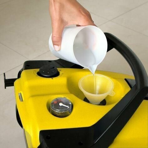 Flexible steam supply hose with gun 3 m, plastic extension tubes 2 pcs. x 0.5 m, measuring cup, funnel, microfiber nozzle for a triangular brush, a set of microfiber cloths for cleaning the floor