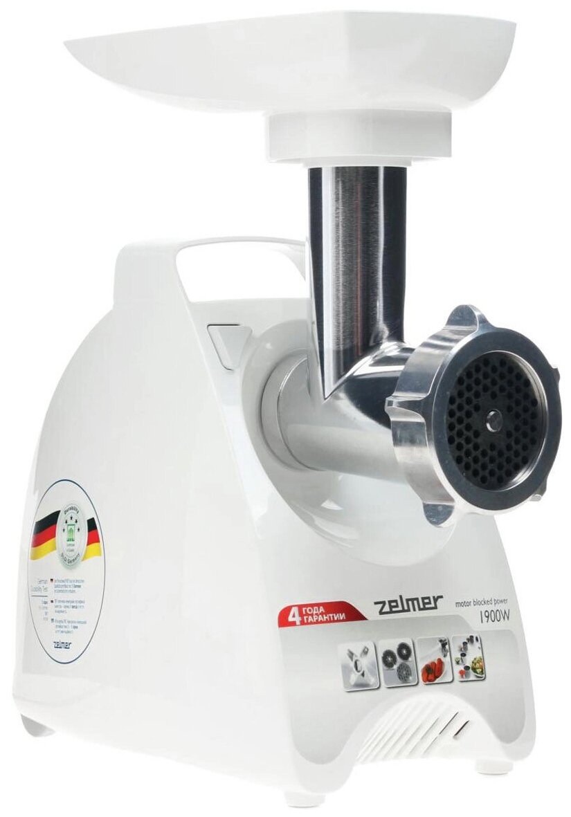 Attachments: disk for minced meat, attachment for kebbe, attachment for preparing sausages, attachment for shredding, attachment-grater, body material: plastic, reverse system, capacity: 2.30 kg/min, features: overload protection