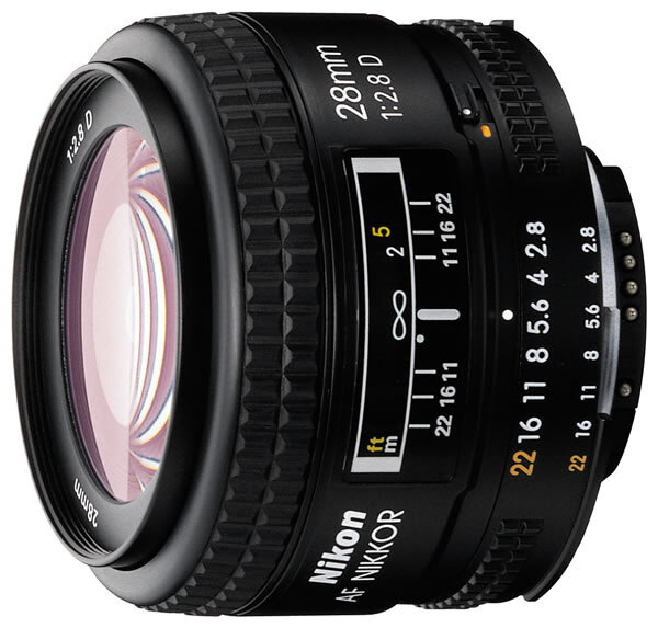 Mount: Nikon F, lens type: wide-angle, focal length: fixed, auto focus, prime lens focal length: 28 mm, aperture F at min. focal length: 2.80