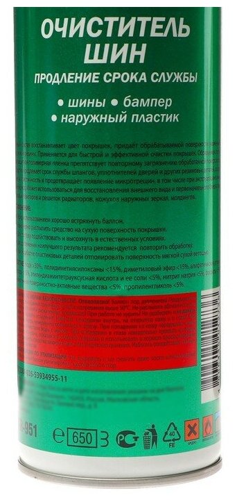 Type: cleaner, vehicle type: trucks, cars, motorcycles, action: restoration of the original color of the tire surface, shine, features: can be used on wet tires