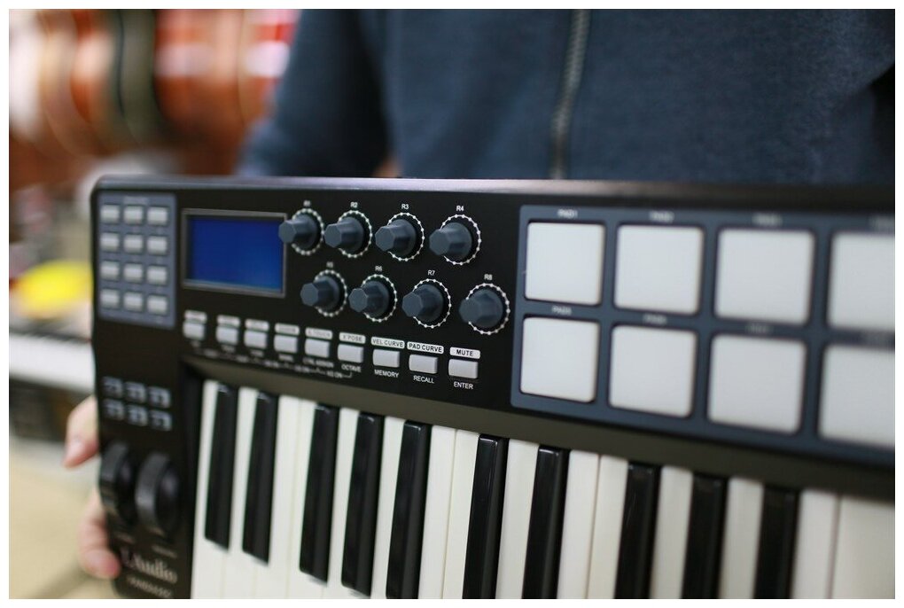 Number of keys: 25, key size: full size, keyboard hardness: semi-weighted, display, pedals: pluggable, pitch bend controller, modulation controller, body: compact, USB Type A, MIDI in, out