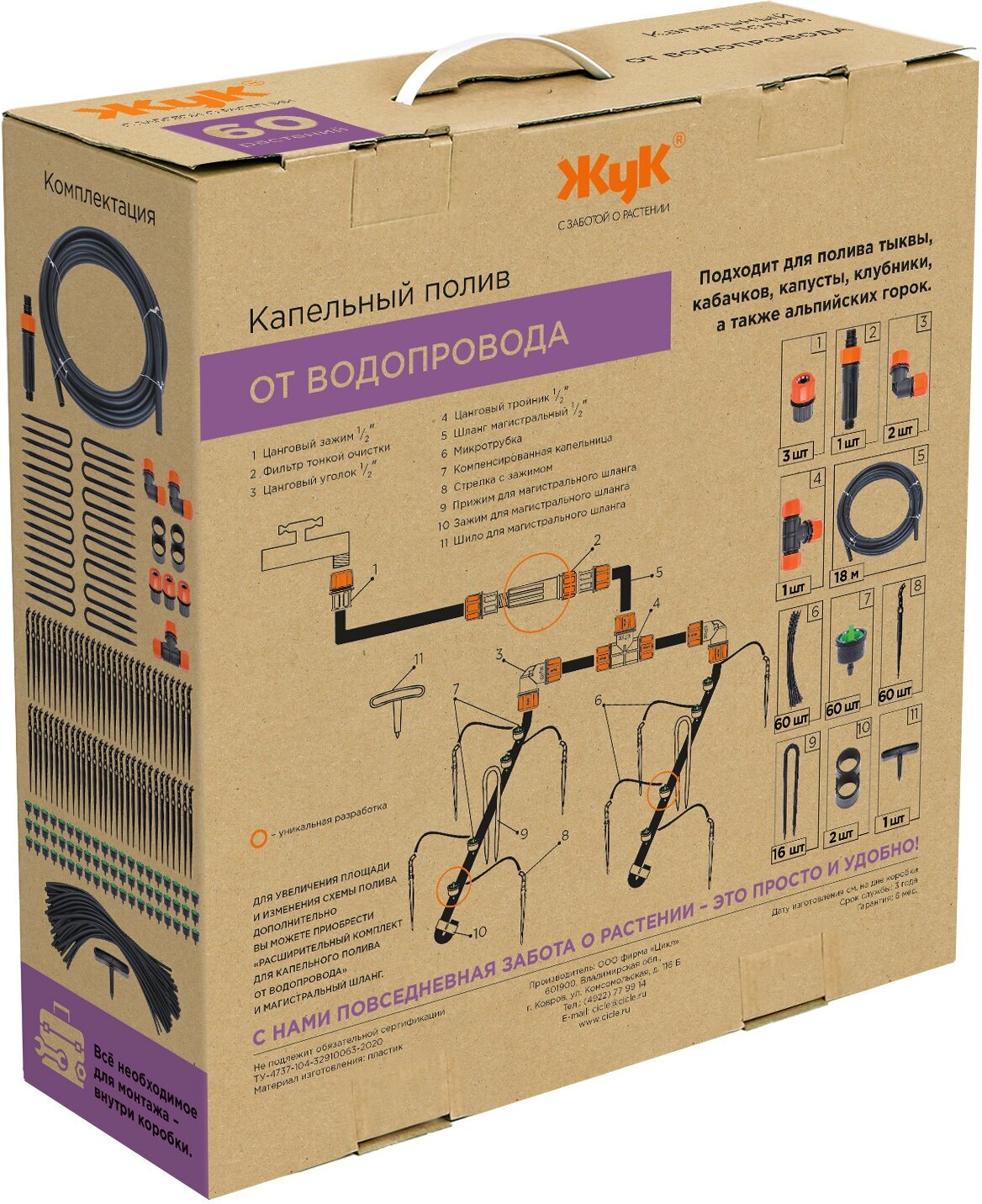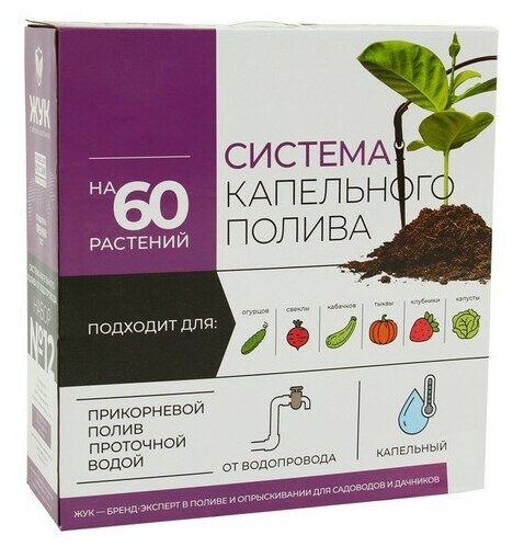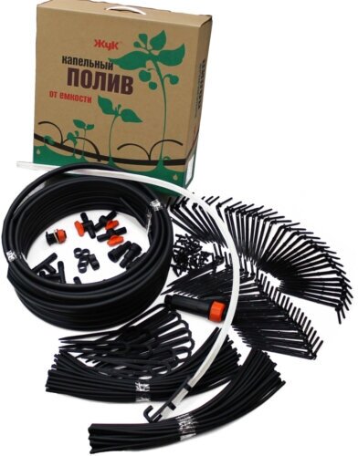 Main hose - 18 m - 1 pc., microtube - 60 pcs., collet tee 1/2-1 pc., collet clamp 1/2-3 pcs., collet angle 1/2-2 pcs., compensated dropper - 61 pcs. ., arrow with clip - 60 pcs., fine filter - 1 pc., clip for ma