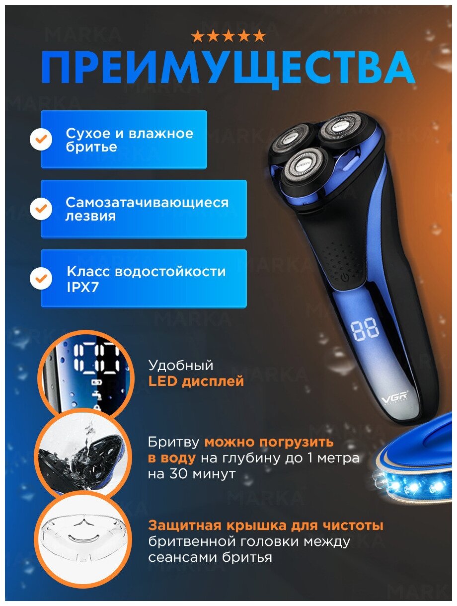 Shaver type: rotary, shaving method: wet, dry, power supply: autonomous/mains, features: fast charging, display, for sensitive skin, powered by USB, number of shaving elements: 3, waterproof case, tee