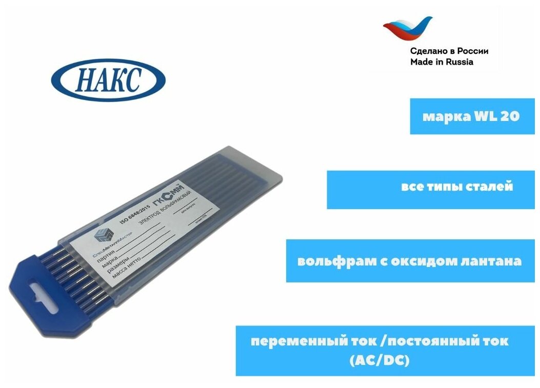 Electrode type: for argon arc welding, electrode material: tungsten, purpose: all types of steel, electrode length: 17.50 cm, welding mode: AC/DC, color: blue
