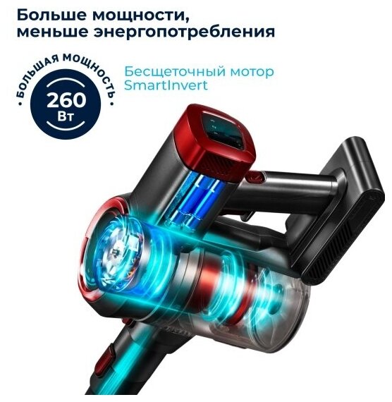 Three operating modes: Eco mode up to 50 minutes without recharging, basic mode up to 25 minutes, Turbo mode up to 15 minutes; suction power: 12,000, 17,000 and 24,000 Pa; tube material: metal; Body material: ABS plastic, aluminum; battery charging time