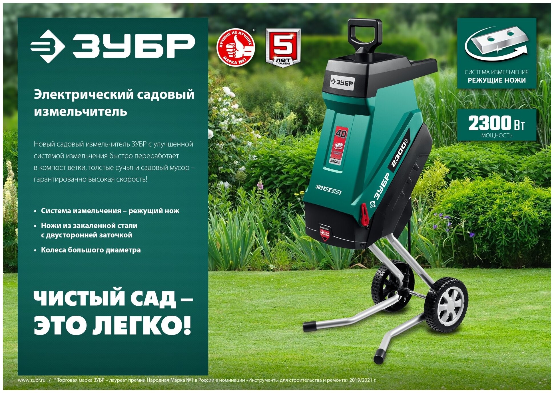 Engine type: electric, power: 2300 W, power: 3.13 hp, purpose: chopping branches and leaves, chopping system: cutting knives, branch diameter: 30–40 mm, capacity: from 50 to 100 kg/h, additional functions