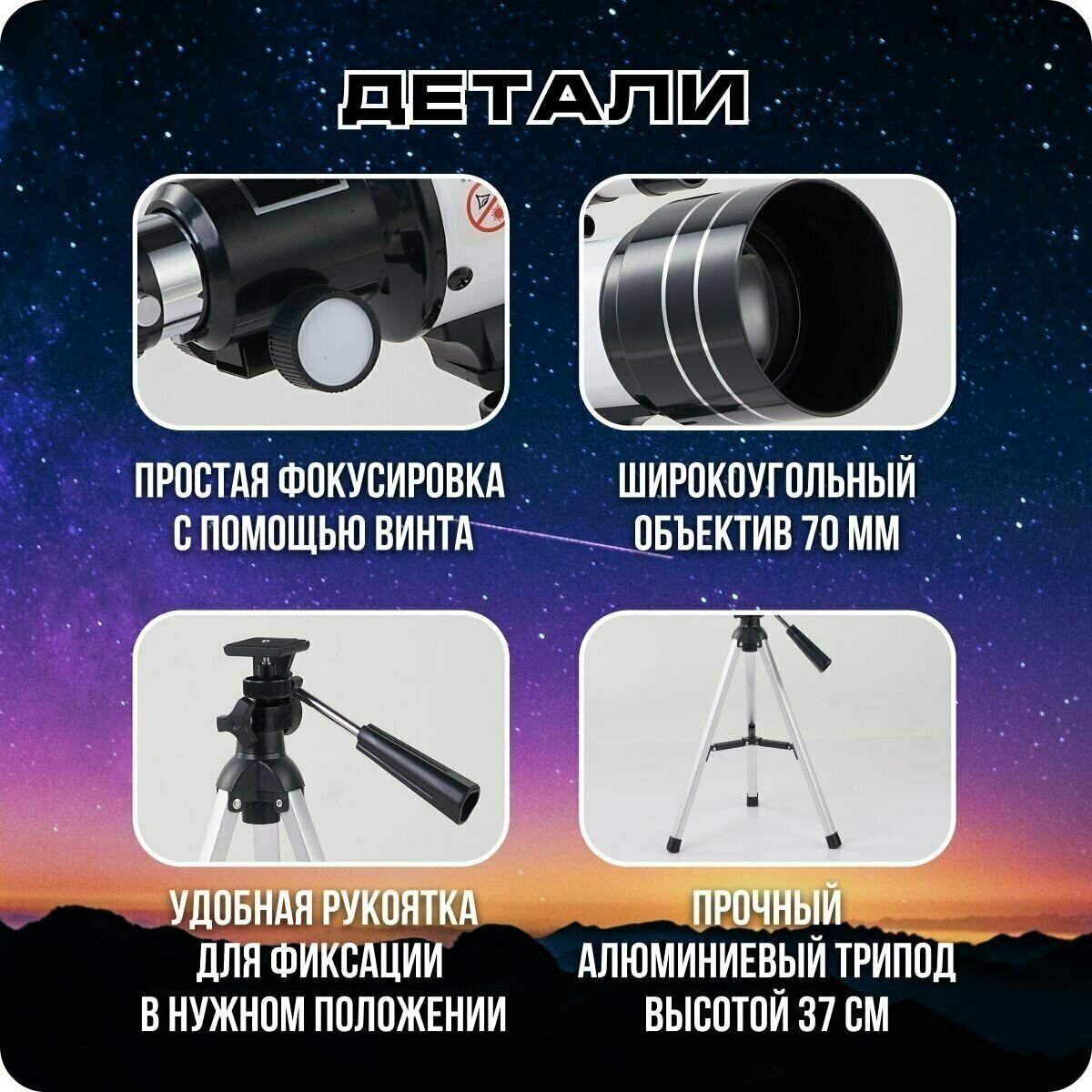 Telescope - 1 piece, eyepieces 6 mm and 20 mm, tripod - 1 piece, constellation map - 1 piece, lunar filter - 1 piece, protective cover - 1 piece, diagonal mirror - 1 piece, viewfinder - 1 piece, BARLOW lens 1.5 x - 1 piece, BARLOW lens 3 x - 1 piece, inst