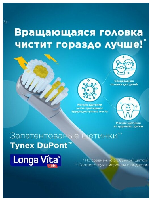 Purpose: for children, brush type: rotary electric, power supply: battery operated, operating modes: delicate cleaning, attachments: soft, number of attachments included: 2, number of reciprocating movements: 6000