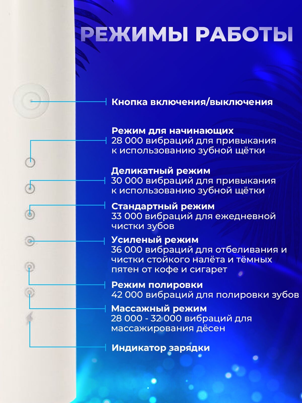 Purpose: for adults, for children, type of brush: sonic, power supply: battery, operating modes: delicate cleaning, daily cleaning, massage, whitening, gum care, nozzles: standard, number of nozzles in a box