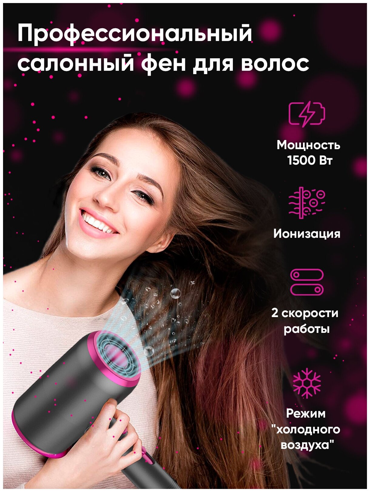 Type: hair dryer, hair dryer power: 1500 W, additional functions: ionization, cold air supply, attachments: concentrator, weight: 2000 g