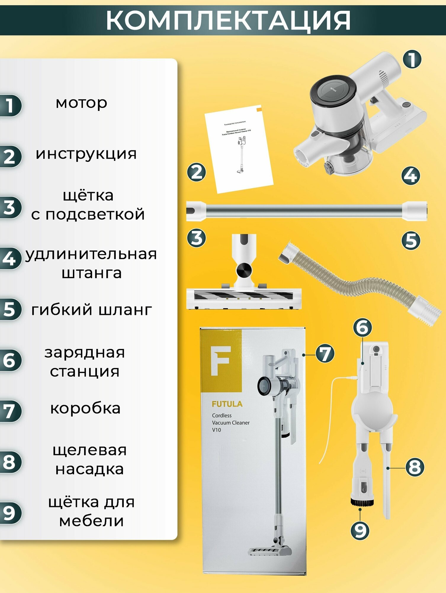 Working time: normal mode 35 minutes, turbo mode 20 minutes; complete set: main brush 1 pc, vacuum cleaner 1 pc, handle 1 pc, crevice brush 1 pc, brush 2in1 1 pc, adapter 1 pc, instruction 1 pc
